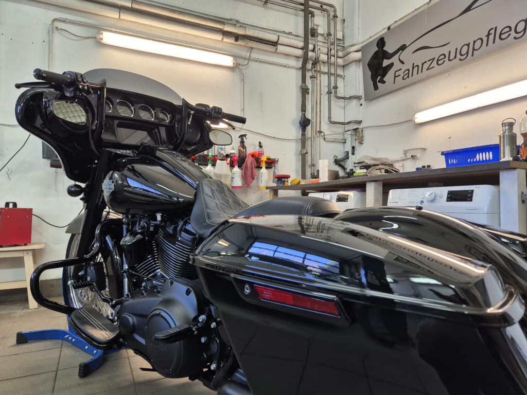 Nach der Keramikversiegelung erstrahlt die Harley Davidson Street Glide in einem unvergleichlichen Glanz. Die Lacktiefenwirkung ist atemberaubend, und die wasser- sowie schmutzabweisenden Eigenschaften sorgen dafür, dass das Motorrad stets wie neu aussieht.